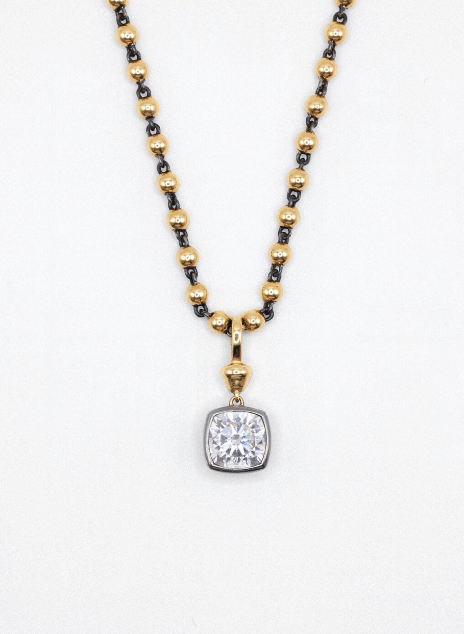 The Serene II Beaded Necklace pairs glowing yellow gold with the quiet depth of oxidised metal. A diamond rests at its centre - light emerging from shadow. Contemporary yet enduring, it’s a piece that draws attention softly, designed for those with an eye for quiet distinction.